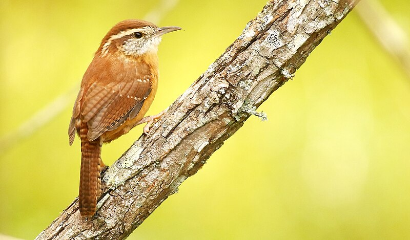 The Carolina Wren is a stocky, round-bodied songbird measuring 12.5 to 14 cm in length with a wingspan of about 29 cm and a weight of 18 to 23 grams, making it the second largest wren in the United States. It has rich rusty-brown upperparts, warm buffy-orange underparts, and bold white eyebrow stripes that extend from the bill to the nape. The wings and tail are barred with black, and the tail is often held cocked upward in the typical wren posture. Its slightly curved bill is proportionally long and well-suited for probing into crevices for insects.
