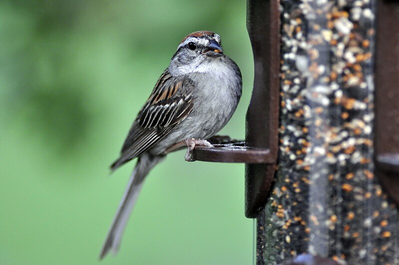 Chipping Sparrows are approachable, relatively tame birds that forage on the ground in small flocks, often on lawns, roadsides, and picnic areas. They get their name from the sharp "chip" call note given throughout the day. The male's song is a rapid, dry trill on a single pitch, often delivered from an exposed perch in a tree. During the breeding season, pairs become territorial, with the female building a characteristically flimsy nest often lined with horsehair or fine animal hair. Outside of breeding season, they gather in loose flocks that may mix with other sparrow species. They are frequent hosts for Brown-headed Cowbird eggs.