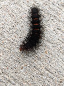 An elusive but beautifully patterned moth. The giant leopard moth is a large white moth that is easy to identify. The forewings have numerous black spots, many with hollow (white) centers. Some of the dark markings are iridescent blue in the light. The hindwing is shaded with black along the inner edge and has spots near the outer tip. The caterpillar is of the “woolly bear” kind, with a thick coat of black bristles and red or orange bands between its segments.