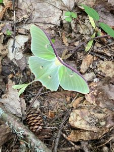 One of the most recognizable moths in North America. It boasts large, lime-green wings and a white body. The hindwings have long curving tails, each with a transparent eyespot. The wings are lined with pink margins.