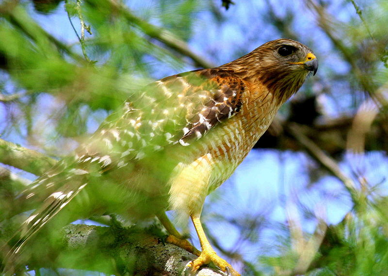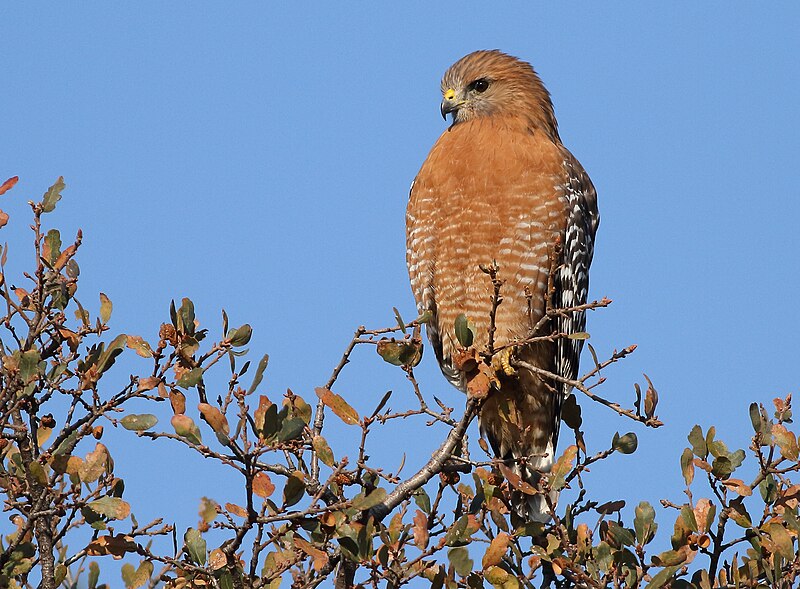The Red-shouldered Hawk is a medium-sized buteo measuring 15 to 24 inches in length with a wingspan of 35 to 50 inches. Adults have a brownish head, rich reddish-barred chest and belly, and dark brown upperparts with reddish-brown “shoulder” patches visible when perched. The tail is distinctly banded with narrow black and white bars. In flight, translucent crescent-shaped wing panels near the wingtips are a key field mark, and the underwings show a boldly banded black-and-white pattern.