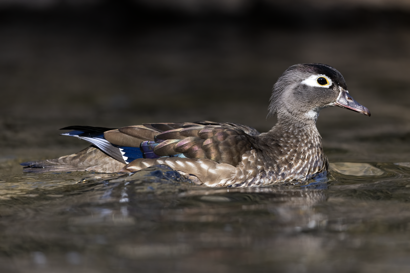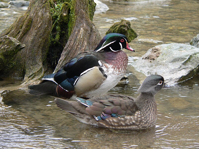 The Wood Duck is a medium-sized perching duck measuring 19 to 21 inches in length with a wingspan of 26 to 29 inches. The adult male is stunningly colorful with iridescent green and purple head plumage, bold white face stripes, a chestnut breast with white flecks, and red eyes. The female is more subdued with grayish-brown plumage, a white teardrop-shaped eye ring, and a whitish throat. Both sexes have distinctly crested heads and broad, squared tails.
