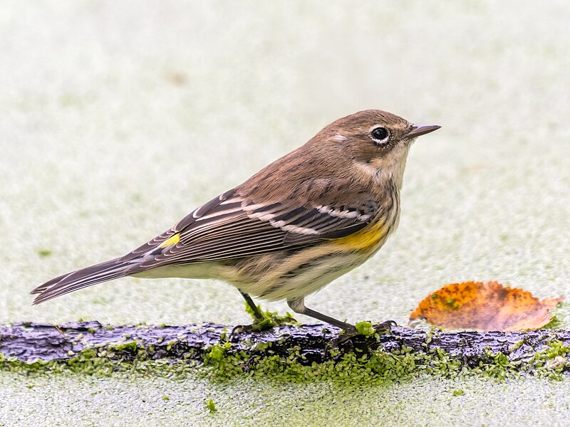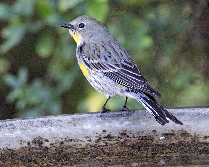 The Yellow-rumped Warbler is a medium-sized wood warbler averaging 14 cm in length and 12.5 grams in weight. The eastern Myrtle Warbler form, which occurs in the Augusta area, displays a streaked gray-blue back, white wing patches, and bold yellow patches on the crown, flanks, and rump during the breeding season. Males have a white throat and a contrasting black cheek patch with a white eyebrow stripe, while females and winter birds are browner and more subdued. The bright yellow rump patch is the most reliable field mark year-round and is conspicuous in flight.